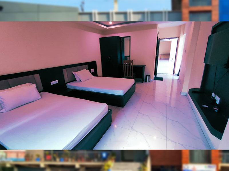 A 3* Category Luxury hotel equipped with 49 aesthetically designed air condition rooms , 02 AC Banquet Hall with the capacity of 50 to 200 pax, 01 Multicuisine Restaurant & 12000 sq.ft green lawn for Social function along with ample parking.